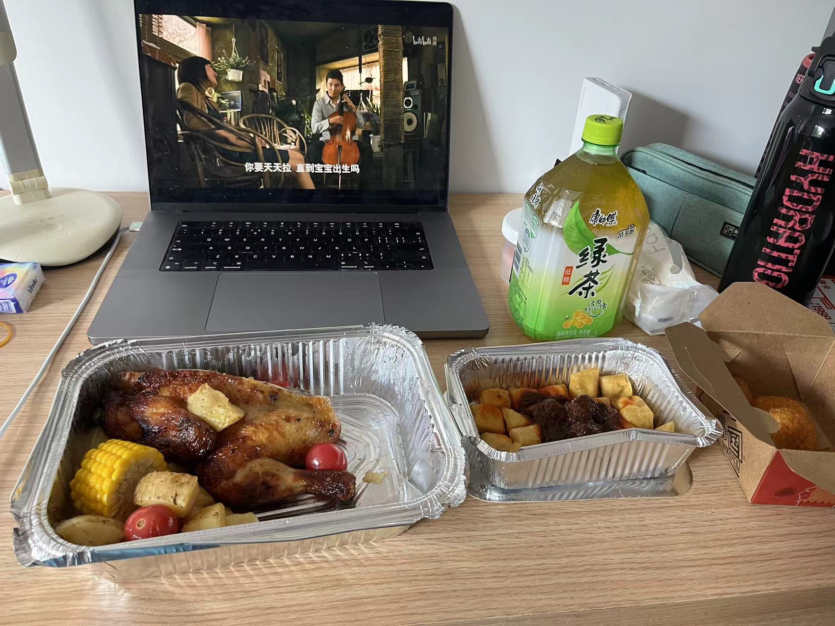 到了 1 点半的时候,去床上躺了一会,不过没有睡着,或许因为我昨晚睡得时间太长了,起来继续接着看,看到 4 点多的时候点了份外卖,于是画面变成了我一边吃外卖一边看:
